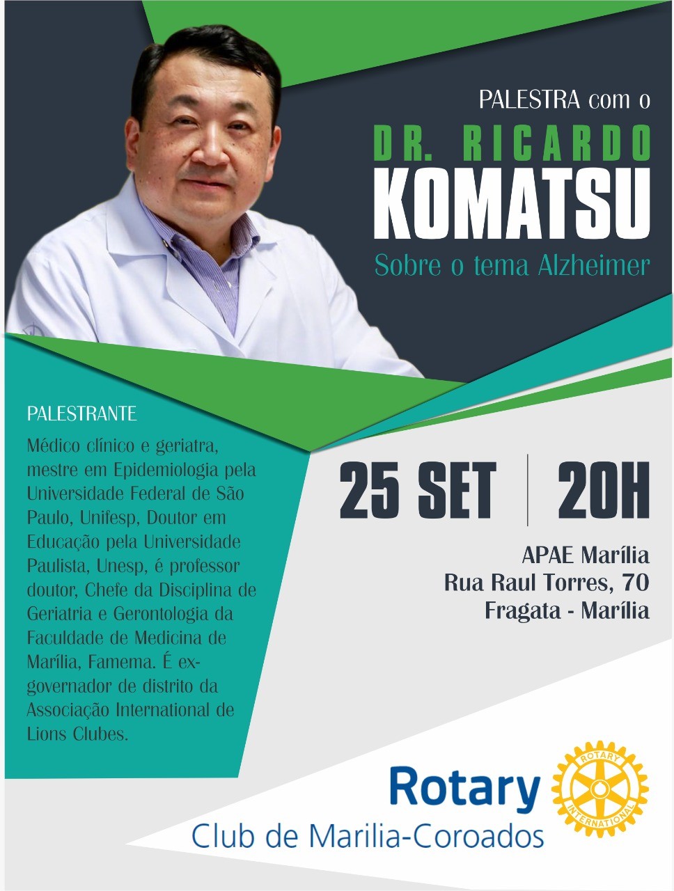 Acontecerá nessa segunda feira dia 25/09/2017 as 20hs no Salão da Apae Marilia, na rua: Raul Torres n70, bairro Fragata, uma Palestra sobre o tema Alzheimer, que será ministrada pelo Dr. Ricardo Komatsu, médico clinico e geriatra, mestre em epidemiologia pela Universidade Federal de São Paulo, doutor em Educação pela Universidade Paulista, é professor doutor e chefe da disciplina de geriatria e gerontologia da Faculdade de medicina de Marilia. e ex Governador de distrito da Associação International de Lions Clubs.